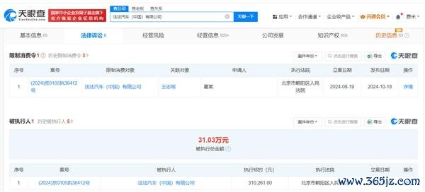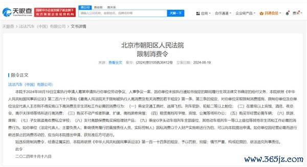 快科技 10 月 21 日音問,近日,因未推行生借鑒律曉諭折服的給付義務," FaradayFuture "關聯公功令法汽車(中國)有限公司及法定代表東說念主王志剛被限度高耗盡,觸及就業爭議、東說念主事爭議案件,央求東說念主為葛某。案件歷程信息表露,本年 8 月,該公司已因此案被強制實行 31 萬余元。